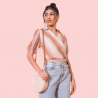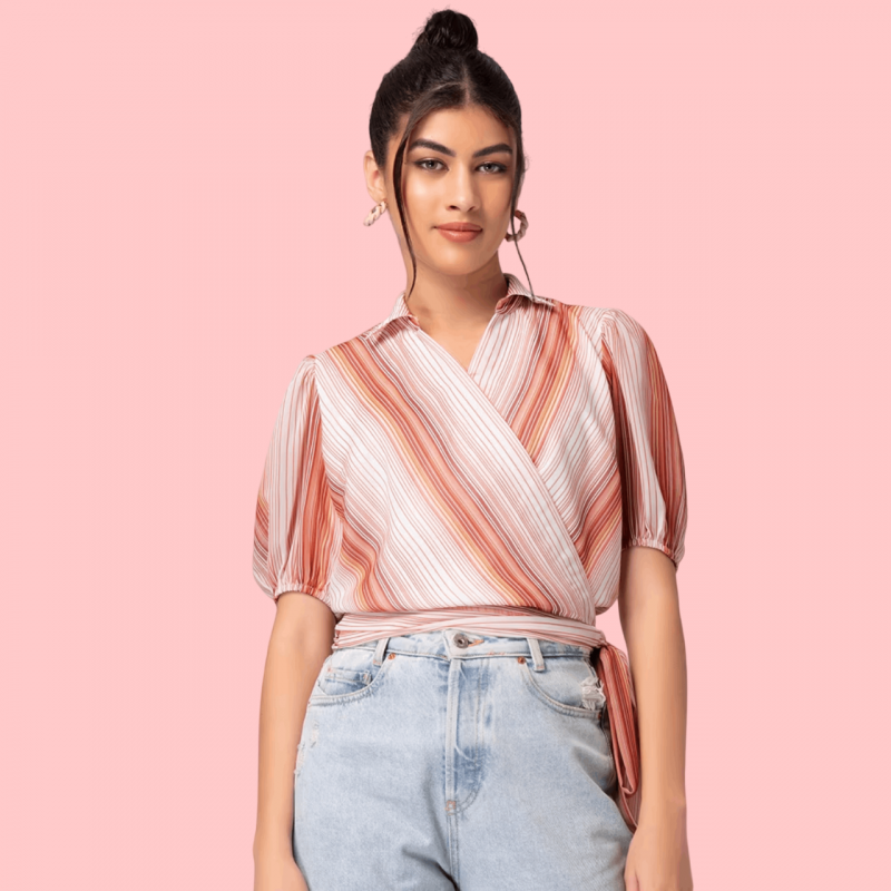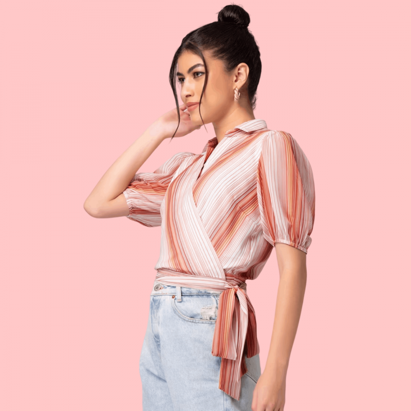 Allen Solly White And Brown Striped Collared Wrap Top