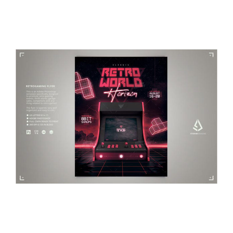 هذا قالب فوتوشوب لألعاب الفيديو القديمة مصمم للإعلان عن أحداث الألعاب القديمة ، وبطولات ألعاب القتال ، ومسابقات القتال بعصا الأركيد ، وألعاب الفيديو بشكل عام ، وحفلات الألعاب الكلاسيكية ، وخزائن الأركيد أو بطولات العملات المعدنية ، ومتاجر الألعاب والمحلات التجارية ، وأي نشاط ألعاب فيديو مماثل.