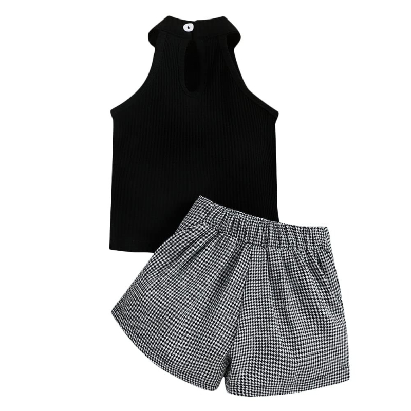 الحجلة بنات بلوزة سادة ومجموعة قصيرة البوليستر باللون الأسود