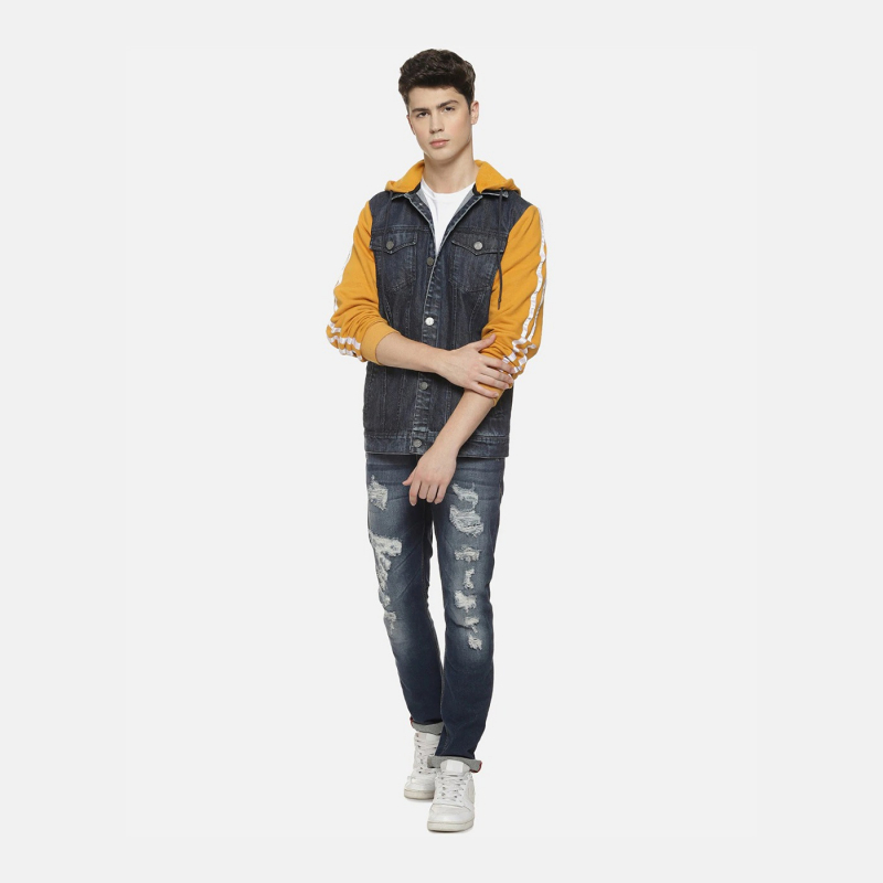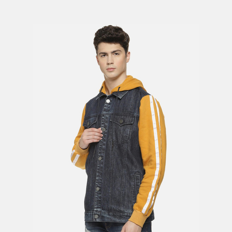 جاكيت جينز غشاش بالفحم مغسول بالفحم، مزود بغطاء رأس و4 جيوب وزر للإغلاق، أكمام طويلة، حافة مستقيمة، بطانة قطنية