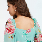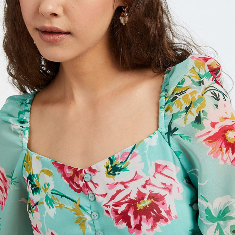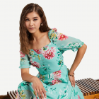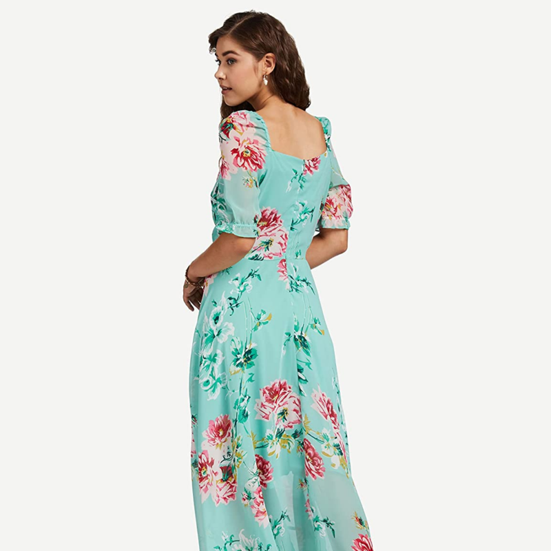 المرأة عارضة الأخضر الأزهار ماكسي حبيب الرقبة أكمام قصيرة تناسب وتوهج اللباس