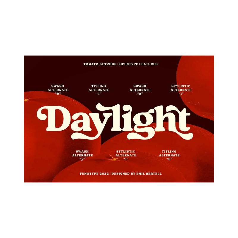 كاتشب الطماطم هو محرف رائع للتصميم الجرافيكي المعاصر مع شعور معين بالألفة. إنه يعمل بشكل جيد على الشعارات أو التغليف أو رسومات المطاعم أو أي استخدام للعرض ، وكذلك في العناوين الرئيسية أو النصوص الأقصر. جرب كاتشب الطماطم مع تتبع منخفض للحصول على صور كلمات أكثر إحكاما ، أو إذا كنت ترغب في استخدامه بأحجام صغيرة حقا ، أضف بعض التتبع.
