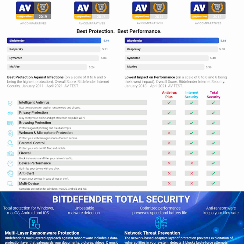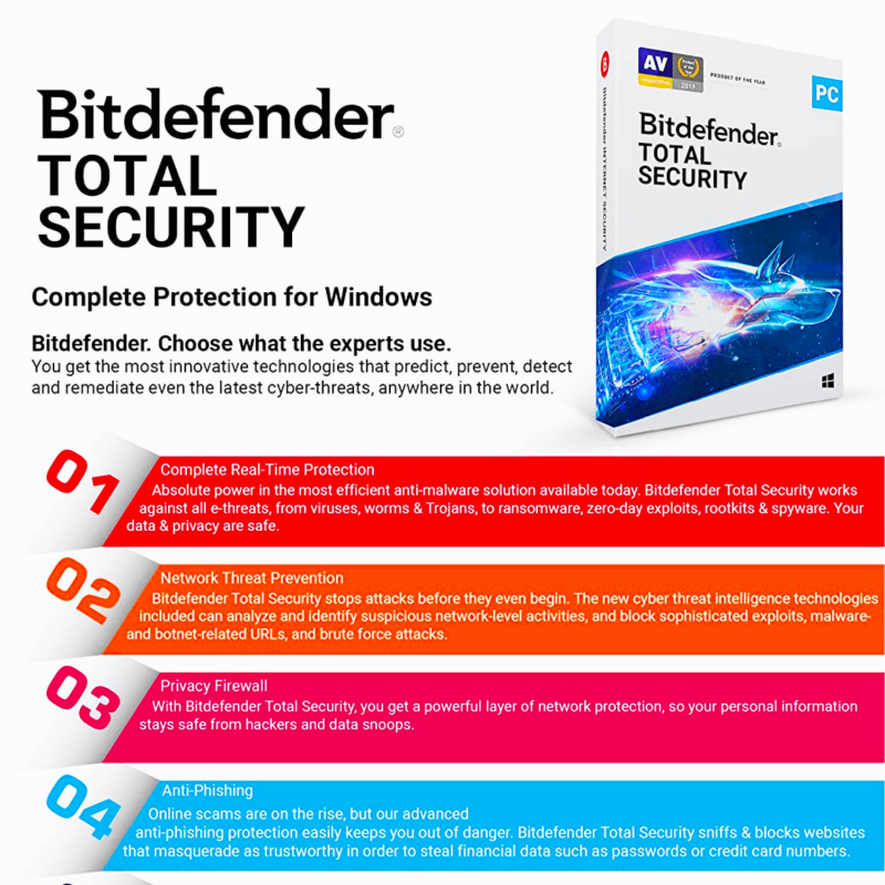 Multi-Layer Ransomware Protection with Bitdefender Safe Files, Bitdefender VPN(200 MB free daily traffic), video & audio protection, Ransomware Remediation, Anti Tracker.