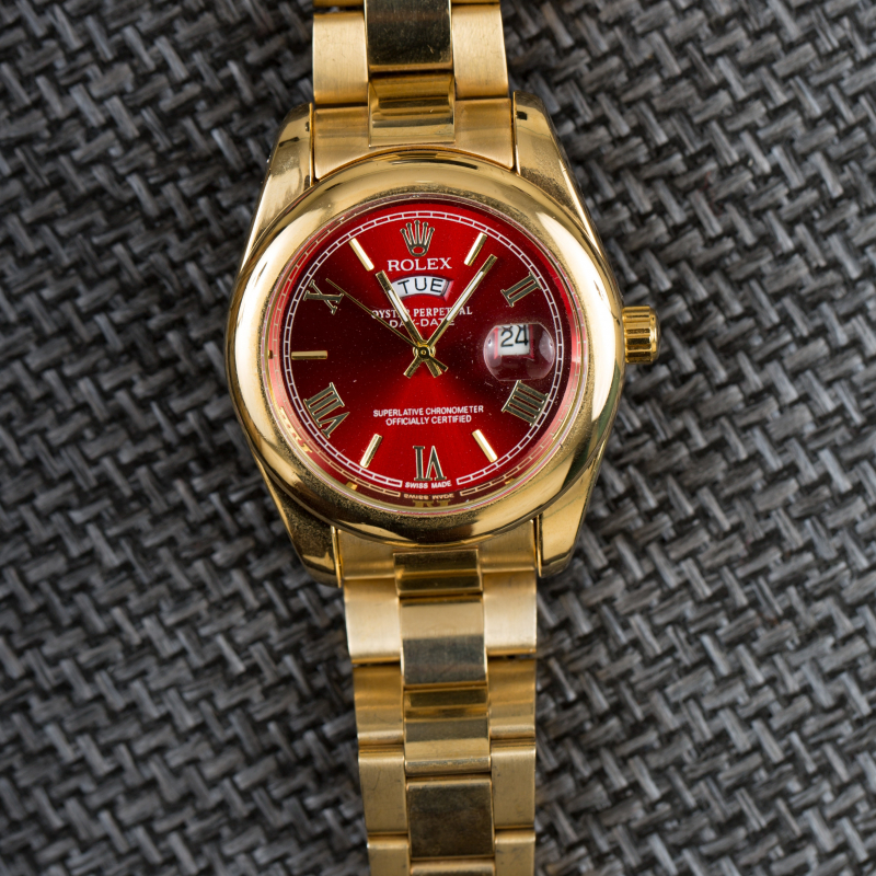 This Oyster Perpetual DAY-DATE 40 in 18 CT yellow gold with a red dial, fluted bezel and a president bracelet.