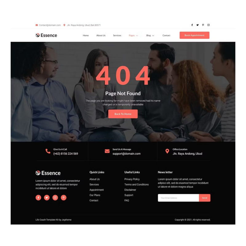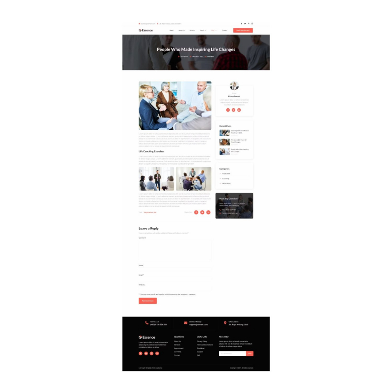 Essence is modern and clean Life Coach and Speaker Elementor Template Kit created especially for life or business coaches and trainers, personal coaches, speaker events, mentoring services website, or counseling company. Essence has a beautiful and unique design with a 100% responsive layout, retina-ready, and without a single line of coding!