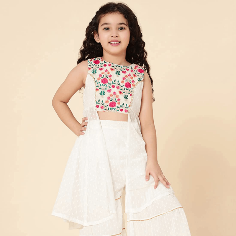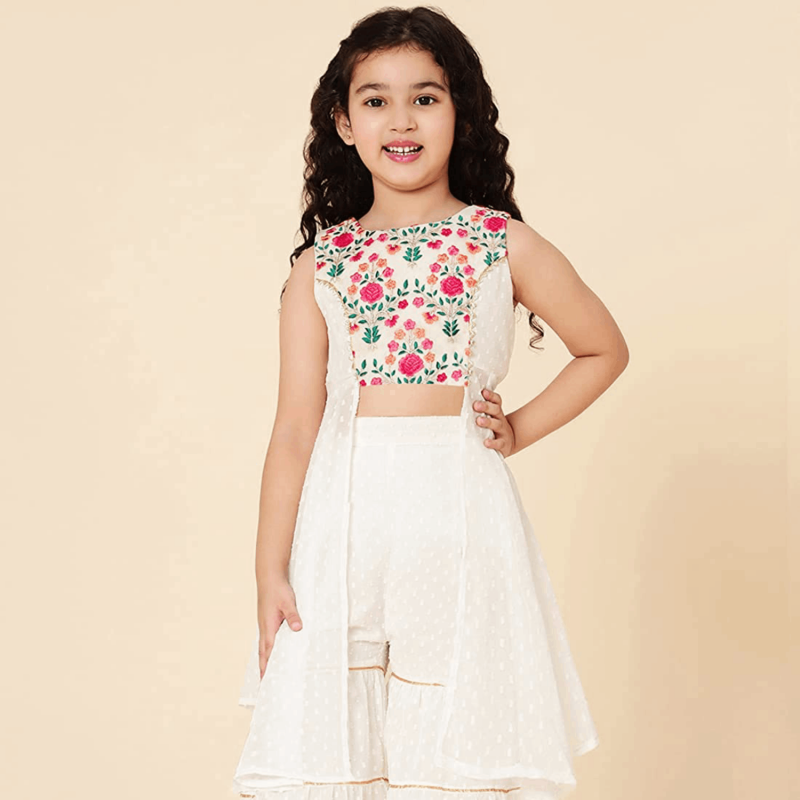 • Beautiful embroidery on the front of the kurta that perfectly fits on to the look and adds to its style quotient. And a beautiful matching sharara that completes the look of your princess making it a must-have occasionwear for her.