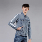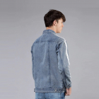 Blue washed denim jacket, has a spread collar, 2 pockets, button closure, long sleeves, straight hem, unlined lining and has chest mock pockets.