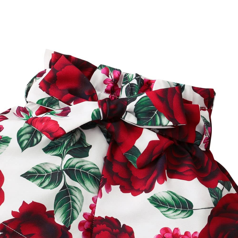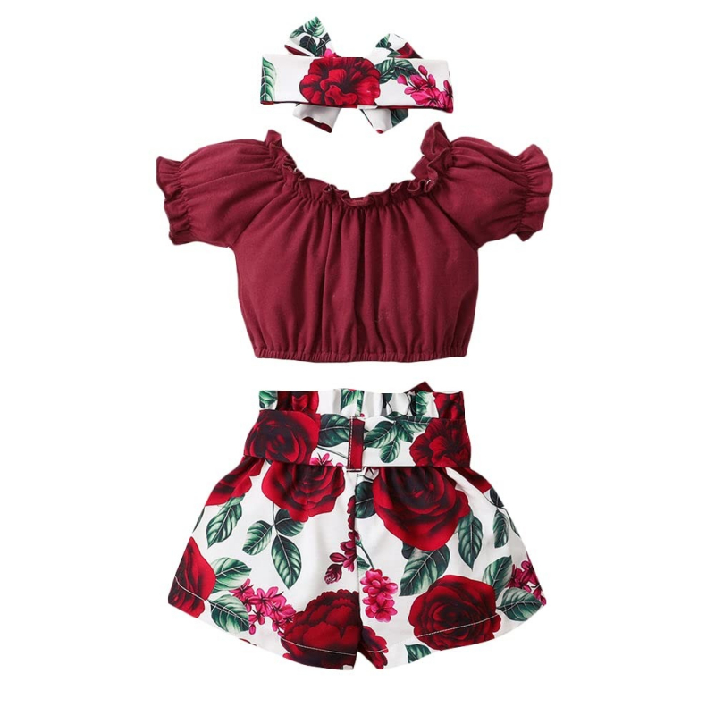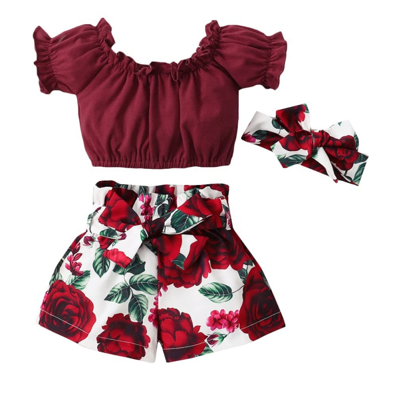 Hopscotch Girls Top and Floral Print Short Set with Headband Cotton and Polyester in Red Color