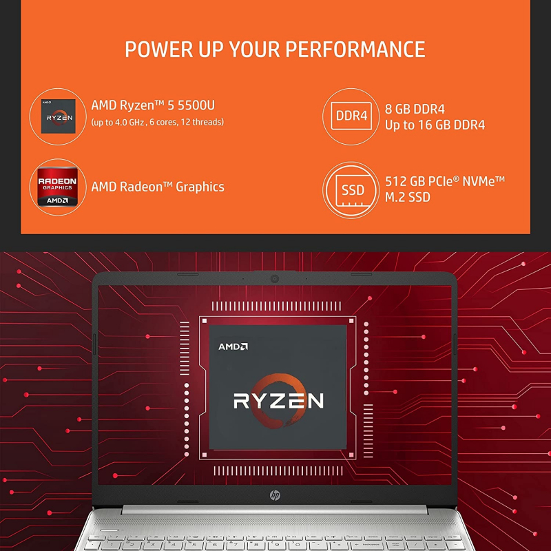 • Processor: AMD Ryzen 5 5500U (up to 4.0 GHz max boost clock(2i), 8 MB L3 cache, 6 cores, 12 threads)| Memory: 8 GB DDR4-3200 SDRAM (1 x 8 GB), Upto 16 GB DDR4-3200 MHz RAM (2 x 8 GB) | Storage: 512 GB PCIe NVMe M.2 SSD