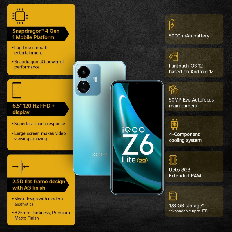 • 5000mAh Battery: Keeps iQOO Z6 Lite 5G to a longer usage, for a more enjoyable gaming and video experience, which offers Music Playback Time of 127 Hours, Social Media of 21.6 hours, OTT Streaming of 14.5 hours and Gaming of 8.3 hours.