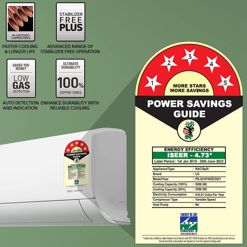 • Energy Rating: 5 Star - Best in class efficiency | Annual Energy Consumption: 818.81 Units per year | ISEER Value: 4.73 (Please Refer to Energy Label On Product Page Or Contact Brand For More Details). The star rating is per BEE guidelines on or before 30th June 2022.