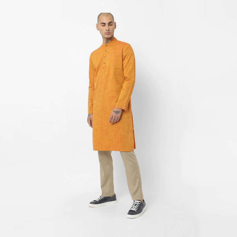 • Flaunt your style with a kurta from Netplay. You'll look dapper as ever in this yellow piece paired with slim jeans and sandals, ideal for any nice family gathering.