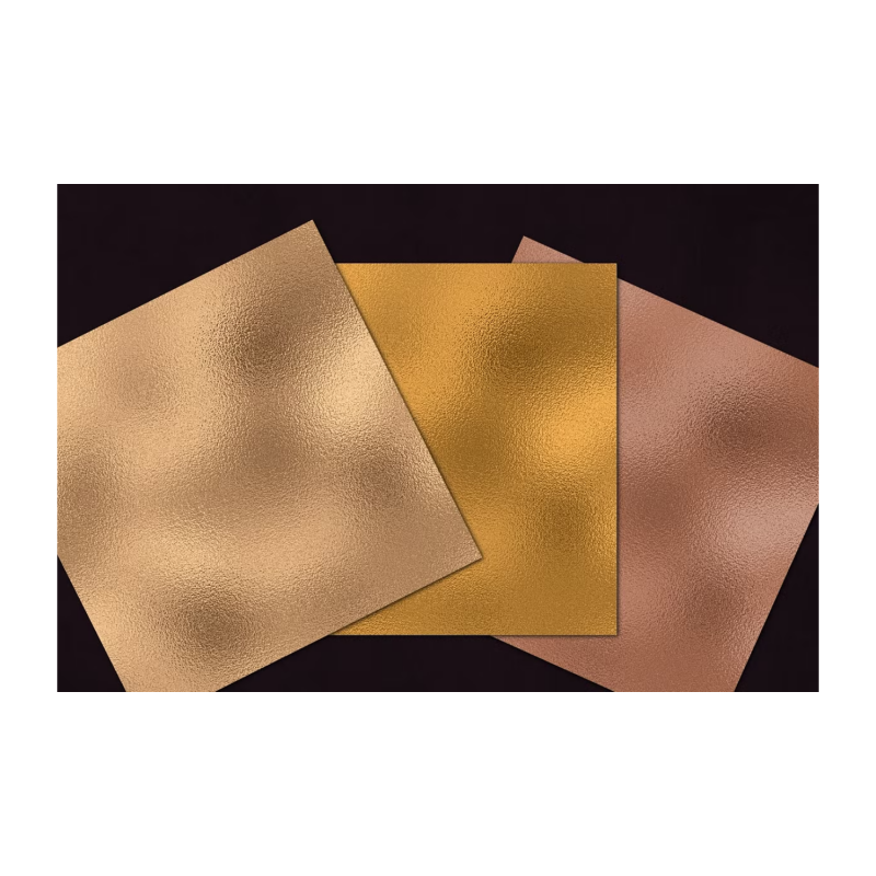 Metallic foil textures in a range of metal hues including gold, silver, rose gold, copper, and titanium. Includes fourteen 12 x 12 inch jpegs (300 dpi).