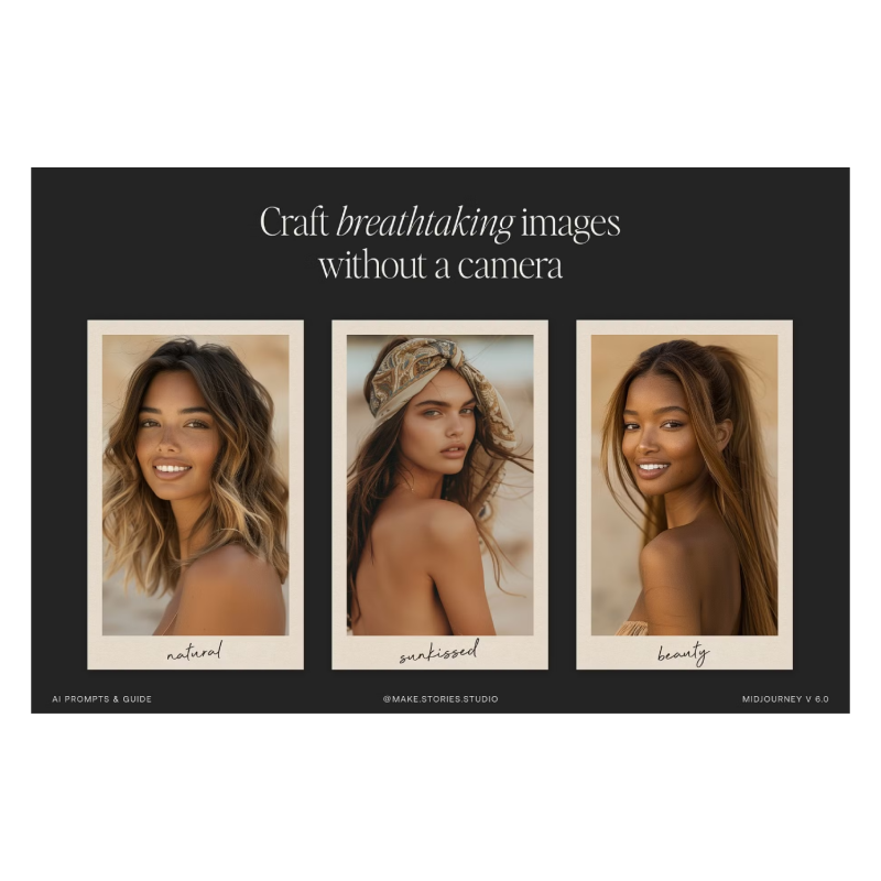 This prompt collection has been tuned to perfection. It took a while but we got there! Introducing our new collection of aesthetic AI prompts for Midjourney V 6.0. Create stunning stock images of sun-kissed beauty models. These prompts produce realistic photos perfect for social media, website design, branding, advertising, and other creative business and entrepreneurial projects.