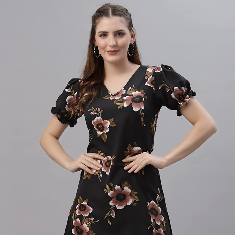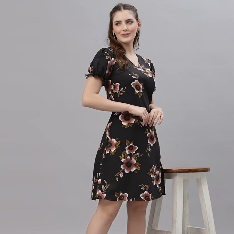 OOMPH! Mini/Short A-line Dress in Crepe Fabric with V Neck and Puff Sleeves