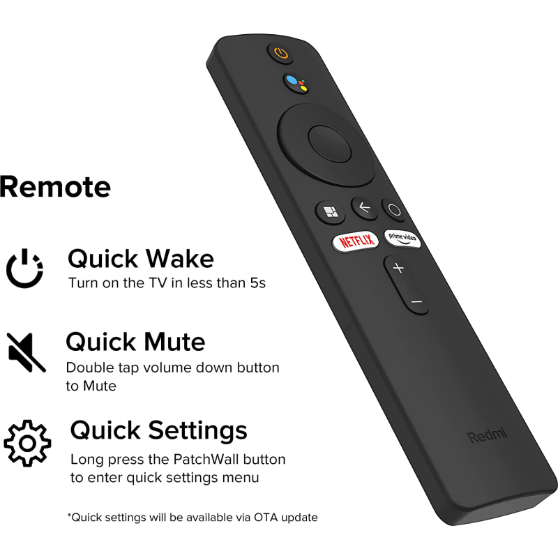 • Smart TV Features : Android TV 11 | Chromecast built-in | PatchWall 4 with IMDb integration | Kids Mode with Parental Lock | 75+ Free Live Channels | Universal search | Language Universe (16+ Languages) | India's Top 10 | Miracast | Supported Apps: Prime Video | Netflix | Disney + Hotstar | YouTube | Apple TV | 5000+ apps from Play Store | Auto Low Latency Mode | Quad core processor | Dual band Wi-Fi | 1GB RAM + 8GB Storage