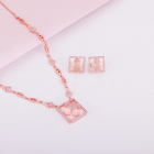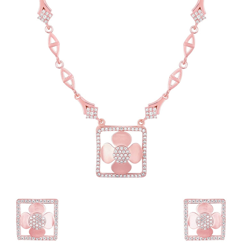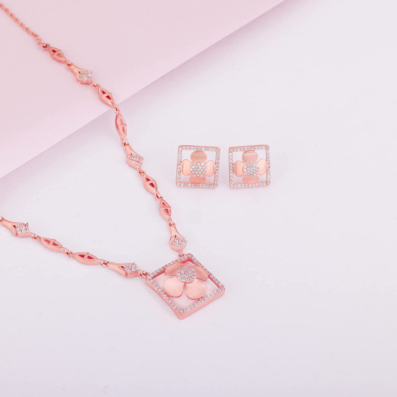 • PRODUCT DETAILS : Made of 925 Silver with Rose Gold Plating, AAA+ Quality Zircons, Includes a necklace and a pair of earrings, Necklace Charm: 1.9 cm x 1.9 cm. The length of the necklace is 42 cm with a 3 cm adjustable portion. Earrings Dimensions: 1.4 cm X1.4 cm
