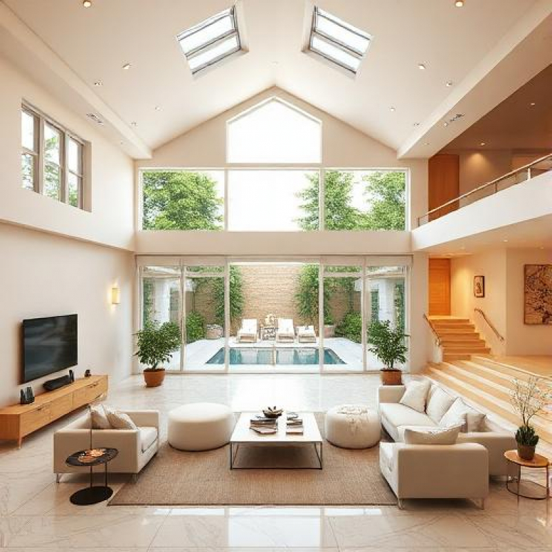 Spacious Living Areas: Double-height living room, dining space, and lounge areas