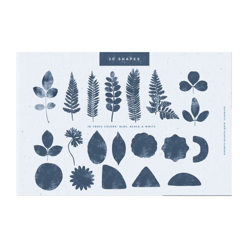Authentic, Textured Botanical and Geometric Shapes, Backgrounds, Paper Textures, Ink Splashes in Black, Blue and White