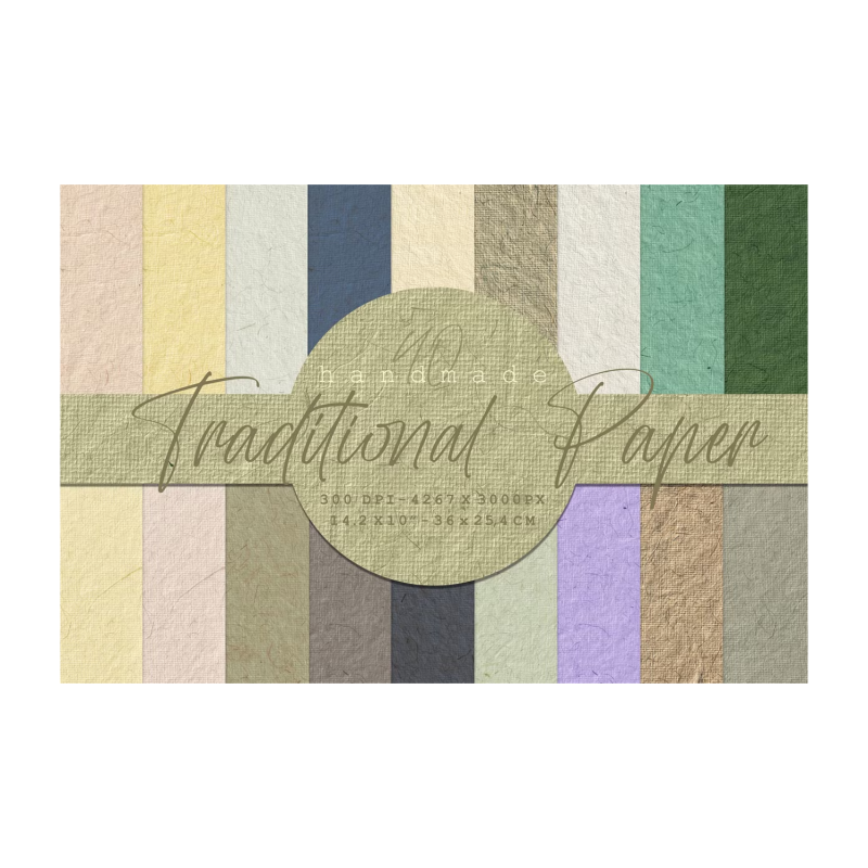 This package; Contains 40 traditional papers made by hand and traditional methods. These papers have a very high texture ratio and are quite different from fabricated papers. Natural materials such as sawdust and bark are boiled and crushed, After a grueling series of processes, traditional paper is obtained. You can easily see the bark fibers, which are as thin as a hair in the texture of the paper.