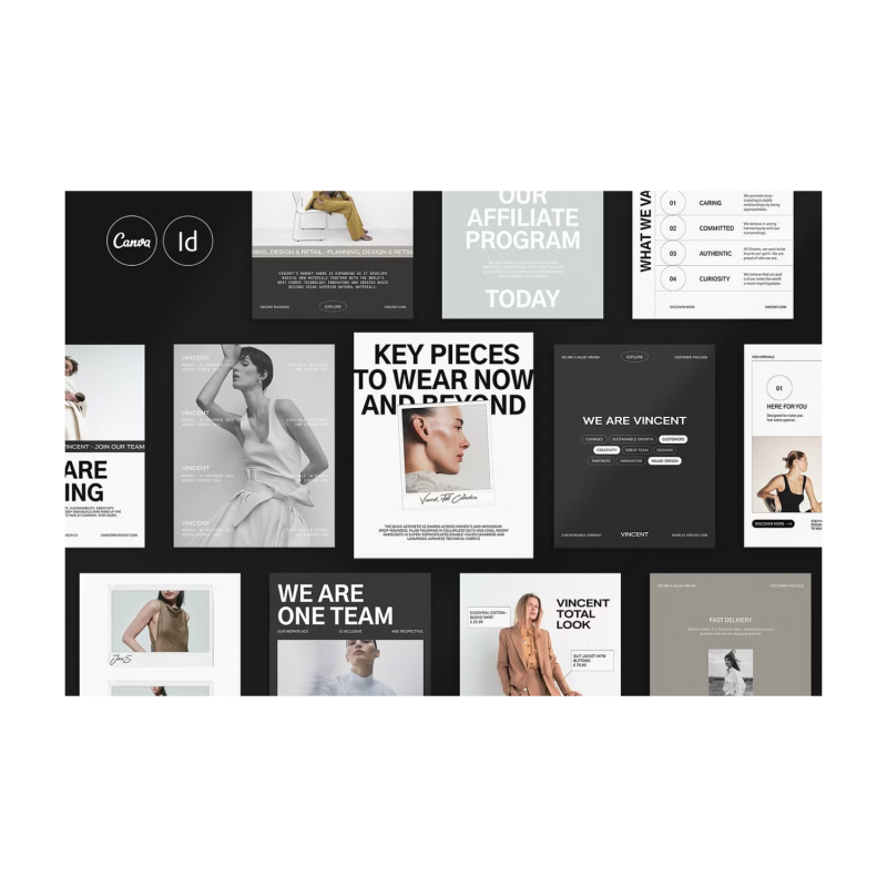 These templates include the original text, giving you a guide on what to write and where. VINCENT Social Media Kit's color palette is minimalist but confident, without losing sophistication, so you can easily integrate your color palette to match your brand. So everything is fully editable.