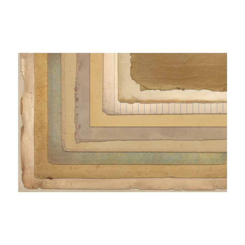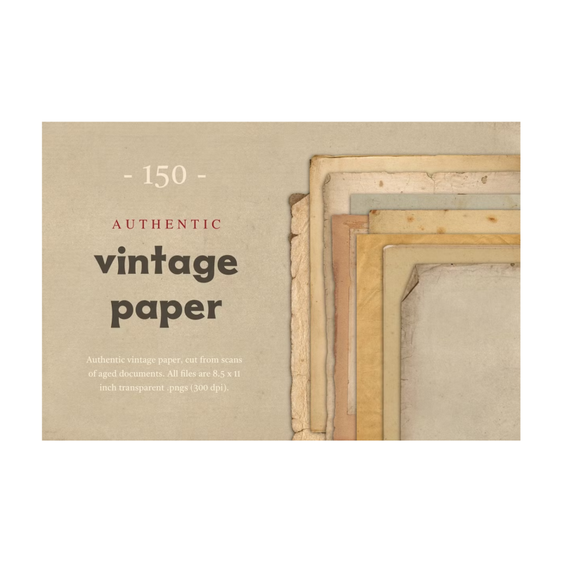 A collection of 150 high resolution genuine vintage paper backgrounds. All files are 8.5 x 11 inch .pngs (300 dpi). Where edges are shown, backgrounds are transparent.