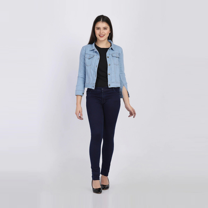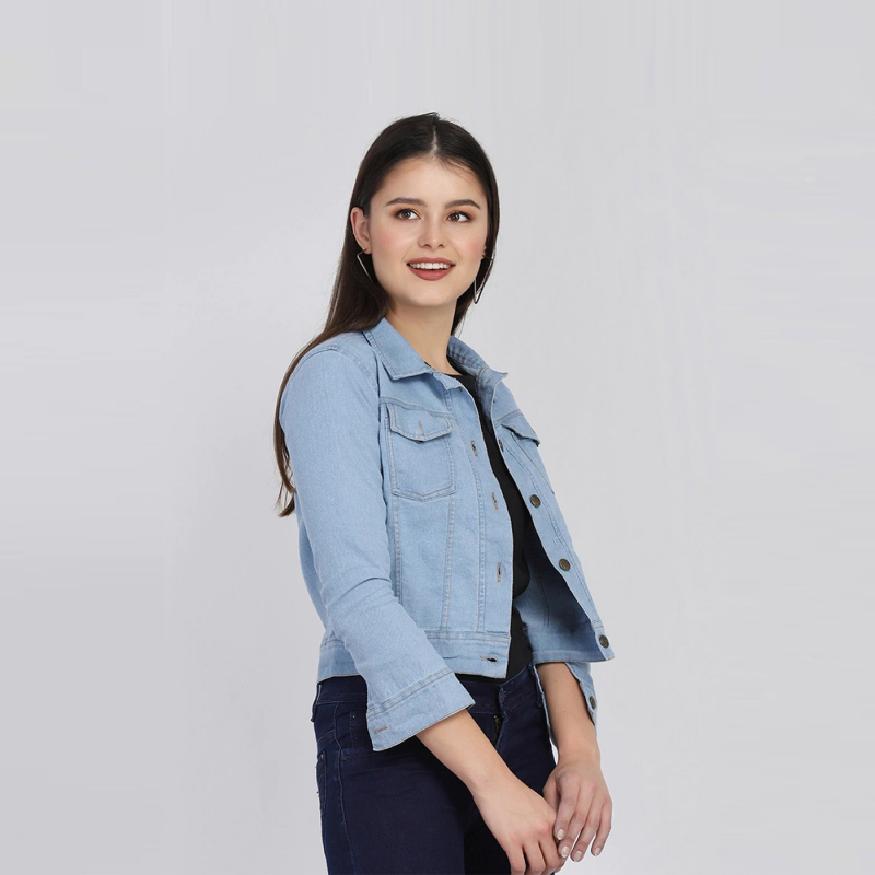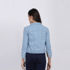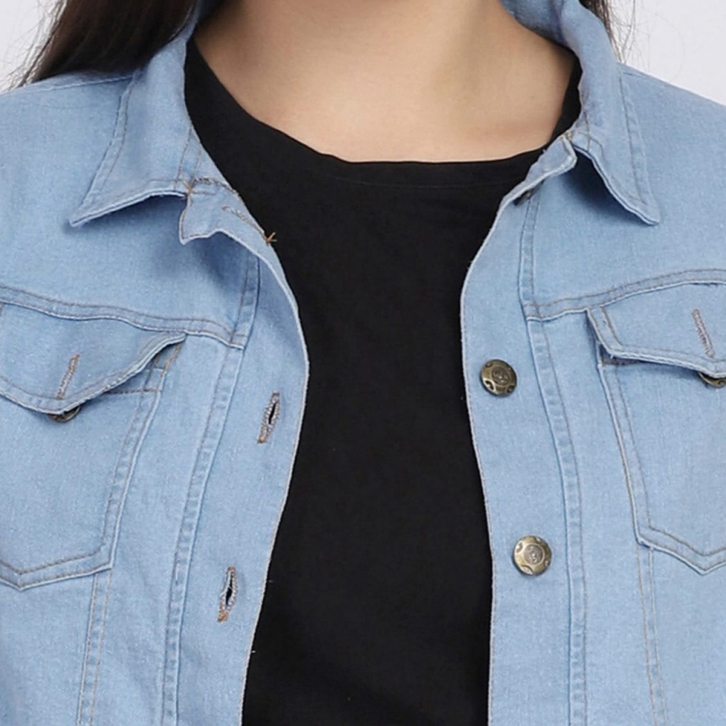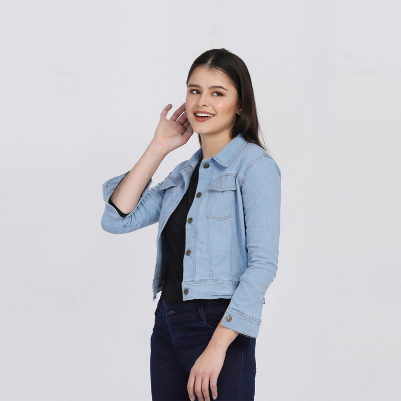 Blue solid lightweight denim jacket, has a spread collar, 2 pockets ,has a button closure, three-quarter sleeves, straight hemline, cotton lining.