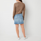 women's high-rise denim mini skirt with a bit of stretch so you can move throughout your day in comfort and features a classic button-zip fly, belt loops, 5-pocket tailoring, and distressed details for an on-trend appeal.