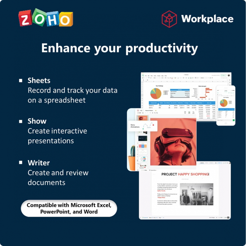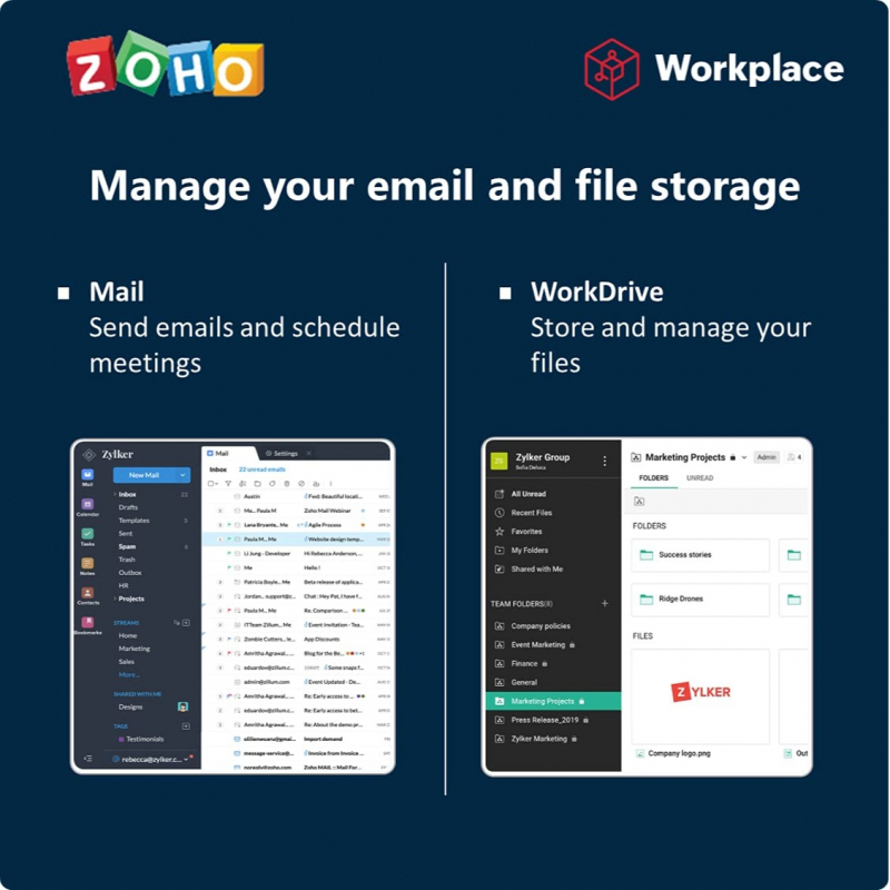 • Connect and collaborate with your team using online meetings, Email, Cliq. Securely create, store and manage files with Zoho Workplace, a better priced solution for your business